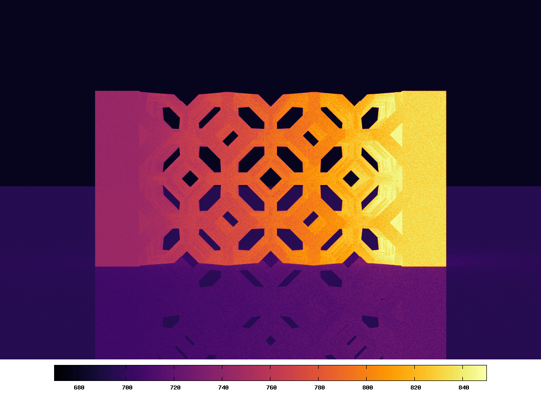 The run_IR_rendering.sh script provides an example to launch stardis in rendering mode. The scene is an idealized porous medium above a reflective plane. Some parameters can be modified in the USER PARAMETERS section, such as the resolution of the image and the number of samples per pixel. For each pixel of the image, the luminance is computed by Monte-Carlo and the number of realizations is the specified number of samples per pixel. Computing a high-definition image with little statistical noise can therefore take a long time (many hours). The values of the parameters provided in the script should result in a computation time of about a dozen minutes on a recent low-end desktop computer.