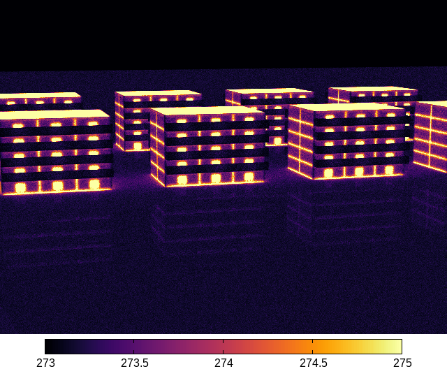 Infrared rendering of the “city” test case illustrating thermal bridges, particularly those coming from the uninsulated roofs. The color map displays the temperature in Kelvin.